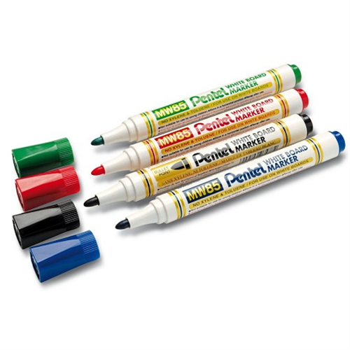 Marcatore per lavagne bianche - PENTEL - MW85 Punta tonda e fusto in plastica con particolari dorati. Inchiostro brillante facile da cancellare. Cappuccio quadrato che impedisce al marcatore di rotolare.