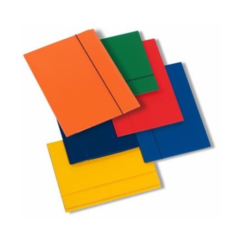 Cartellina 3 lembi in cartone 600gr con elastico tubolare. plastificazione lucida in 8 colori assortiti. Dimensione 25,5x35cm