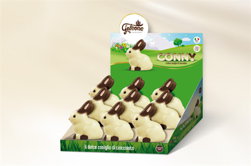 Il dolce coniglio di cioccolato bianco decorato a mano gr.120. Dimensione: 14x25x17cm.