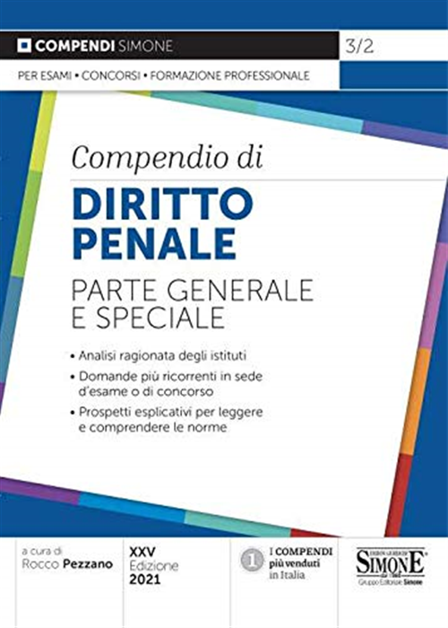 Il testo Diritto Penale, parte Generale e Speciale è un compendio, giunto alla venticinquesima edizione, diretto a fornire, accanto ad un esame degli istituti di diritto penale generale (cui si aggiunge una mirata selezione di fattispecie di reato di fonte codicistica) taluni fondamentali spunti giurisprudenziali e dottrinari, per dare la possibilità, a quanti necessitano di un testo agile, sintetico e aggiornato, di soffermarsi prevalentemente sugli argomenti di maggior interesse. Proprio per la sua struttura organizzativa ed il puntuale aggiornamento il libro rappresenta un utile strumento di studio sia per studenti universitari e sia per coloro che devono affrontare prove concorsuali e/o abilitazioni. Fra le novità legislative di cui si tiene conto nella presente edizione, si segnalano i correttivi codicistici a tutela dell’ordine e della sicurezza pubblica, operati dal c.d. Decreto sicurezza-ter (D.L. 21-10-2020, n. 130, conv. in L. 18-12-2020, n. 173), il «giro di vite» alle tutele penali degli esercenti le professioni sanitarie, effettuato dalla L.14-8-2020, n. 113, la riforma della struttura oggettiva del delitto di abuso d’ufficio, effettuata dal c.d. «Decreto semplificazione» (D.L. 16-7-2020, n. 76, conv. in L. 11-9-2020, n. 120) e le modifiche funzionali alla lotta contro la frode lesiva degli interessi finanziari dell’Unione Europea, dovute al D.Lgs. 14-7-2020, n. 75. Questo compendio di Diritto Penale, parte Generale e Speciale si caratterizza, altresì, per una serie di prospetti esplicativi, denominati «Spiegare le norme», con i quali si è inteso fornire all’utente uno strumento per andare al di là del semplice significato letterale dei termini usati dal legislatore e fornire l’accezione interpretativa più aderente al contesto applicativo della norma. Il libro, inoltre, è corredato da utili questionari contenenti le domande più ricorrenti in sede di esame o di concorso per permettere di testare il livello di preparazione raggiunto. Un dettagliato indice analitico-alfabetico agevola la ricerca degli istituti.