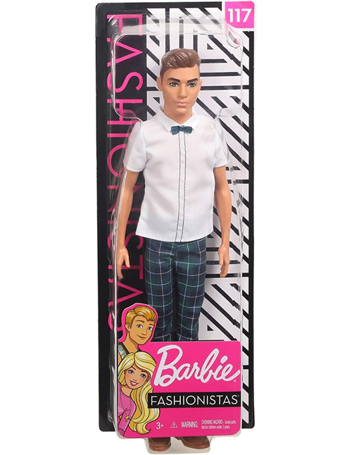 Ken fashionistas di Mattel ha un look e uno stile unico ispirato alle ultime tendenze. Indossa una camicia a mezze maniche bianca con decori, mocassini marroni, pantalone a scacchi sui toni del blu e del verde e papillon coordinato.