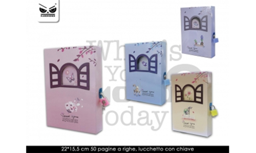 Dimensioni: 22X15,5CM - 50 PAGINE A RIGHE. DOTATO DI LUCCHETTO CON CHIAVE.