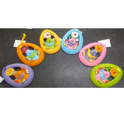 Appendino arancio in ceramica a forma di uovo con pulcino azzurro