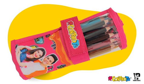 Elegante rotolo "Me contro Te" in stoffa contenente 24 colori ed 1 matita. Chiusura a strappo e piccola taschina porta oggetti per poter riporre gomma e temperino.