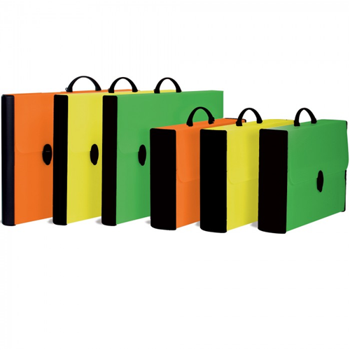 Valigetta in polipropilene alveolare fluorescente con dorsi rigidi in polipropilene nero.