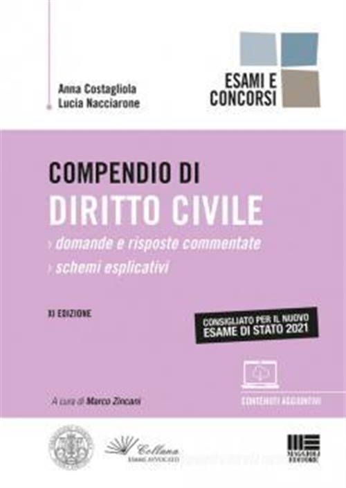 L'opera affronta la vastità degli istituti del diritto civile con un approccio sistematico e strumentale alla preparazione di esami e concorsi. Il volume è aggiornato a: Legge 26 febbraio 2021, n. 21, (conversione in legge, con modificazioni, del D. L. 31 dicembre 2020, n. 183, 'Milleproroghe') che ha prorogato la sospensione dell'esecuzione dei provvedimenti di rilascio di immobili; Legge 18 dicembre 2020, n. 176, di conversione del D.L. 28 ottobre 2020, n. 137, recante Ulteriori misure urgenti in materia di tutela della salute, sostegno ai lavoratori e alle imprese, giustizia e sicurezza, connesse all'emergenza epidemiologica da Covid-19, che ha inciso sull'entrata in vigore della nuova disciplina in materia di tutela dei consumatori (azione di classe) e Legge 27 novembre 2020, n. 159, di conversione del D.L. 7 ottobre 2020, n. 125, che ha prorogato i termini per l'adeguamento degli statuti degli enti del terzo settore.