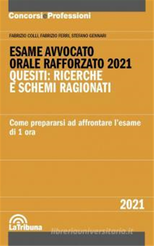 L'esame scritto per avvocato della sessione 2020 è stato riformato con l'introduzione di una "prima prova orale" abilitante alla "seconda prova orale". In sostanza, l'esame scritto è sostituito con una prova orale la quale prevede che la preparazione del candidato venga valutata in relazione alla sua capacità di comprendere e risolvere in 30 minuti un caso pratico in una materia scelta dal candidato tra diritto civile, diritto penale e diritto amministrativo, con l'ausilio dei codici e della giurisprudenza, per discuterne la soluzione successivamente con la Commissione. Si tratta certamente di una modalità di esame particolare che, tuttavia, potrà essere affrontata con tranquillità, se la preparazione sarà adeguata alle novità. In questa prospettiva nasce questo instant book; per aiutare i candidati all'esame 2020 ad adeguare la loro preparazione. In oltre vent'anni di preparazione dei candidati all'esame di avvocato, gli Autori hanno sempre insegnato come individuare rapidamente il quesito giuridico da affrontare per risolvere il caso pratico proposto e come esporre chiaramente il ragionamento che conduce alla soluzione. Forti di tale esperienza, proponiamo questo libro in cui sono compresi numerosi casi pratici (oltre 50) suddivisi per materia (diritto civile, diritto penale e diritto amministrativo), ciascuno corredato da uno schema delle attività da svolgere per guidare la ricerca sui codici e per l'impostazione del ragionamento espositivo della soluzione. Un valido supporto, quindi, per completare la preparazione e affrontare l'esame orale rafforzato senza paura.
