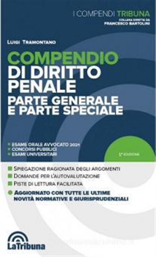 La nuova Collana Compendi Tribuna si rivolge ai candidati ai concorsi pubblici, agli studenti universitari e a tutti coloro i quali siano chiamati a sostenere prove d’esame per l’abilitazione professionale, con particolare riguardo per l’esame orale di avvocato. I Compendi Tribuna si caratterizzano per chiarezza di esposizione, capacità di sintesi e taglio ad un tempo semplice quanto accurato, che consente di apprendere e memorizzare facilmente ogni argomento affrontato. Fra i punti di forza di ogni volume, segnaliamo: - l’accurata suddivisione degli argomenti in paragrafi e sottoparagrafi; - la sapiente utilizzazione delle piste laterali di lettura, che permettono di individuare immediatamente i concetti fondamentali della materia trattata; - l’utilissima selezione di domande per l’autovalutazione immediata del proprio livello di apprendimento; - l’alto livello di aggiornamento normativo e giurisprudenziale; - la presenza dell’indice analitico alfabetico, che rende agevole la ricerca degli argomenti e degli istituti. Il Compendio di Diritto penale, parte generale e speciale, espone in sintesi, ma con estrema chiarezza ed esaustività, tutta la materia normalmente oggetto di esami universitari o di prove di concorso e dà ampio spazio agli orientamenti della dottrina e della giurisprudenza. Gli aspetti salienti della disciplina sono evidenziati attraverso l’uso di piste di lettura a margine del testo. Si avvale, inoltre, di apparati didattici che permettono di ottimizzare l’apprendimento e di avere a disposizione, in un unico volume, molteplici strumenti di studio e di riepilogo della materia (schemi per ricapitolare l’argomento studiato e favorirne l’apprendimento, domande di fine capitolo, che propongono le più frequenti domande d’esame).