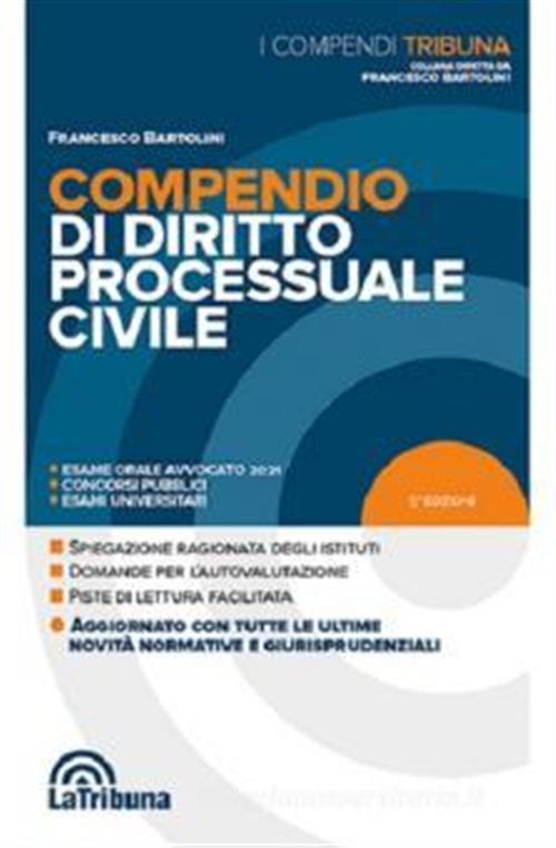 La nuova Collana Compendi Tribuna si rivolge ai candidati ai concorsi pubblici, agli studenti universitari e a tutti coloro i quali siano chiamati a sostenere prove d’esame per l’abilitazione professionale, con particolare riguardo per l’esame orale di avvocato. I Compendi Tribuna si caratterizzano per chiarezza di esposizione, capacità di sintesi e taglio ad un tempo semplice quanto accurato, che consente di apprendere e memorizzare facilmente ogni argomento affrontato. Fra i punti di forza di ogni volume, segnaliamo: - l’accurata suddivisione degli argomenti in paragrafi e sottoparagrafi; - la sapiente utilizzazione delle piste laterali di lettura, che permettono di individuare immediatamente i concetti fondamentali della materia trattata; - l’utilissima selezione di domande per l’autovalutazione immediata del proprio livello di apprendimento; - l’alto livello di aggiornamento normativo e giurisprudenziale; - la presenza dell’indice analitico alfabetico, che rende agevole la ricerca degli argomenti e degli istituti. Il Compendio di Diritto processuale civile, espone in sintesi, ma con estrema chiarezza ed esaustività, tutta la materia normalmente oggetto di esami universitari o di prove di concorso e dà ampio spazio agli orientamenti della dottrina e della giurisprudenza. Gli aspetti salienti della disciplina sono evidenziati attraverso l’uso di piste di lettura a margine del testo. Si avvale, inoltre, di apparati didattici che permettono di ottimizzare l’apprendimento e di avere a disposizione, in un unico volume, molteplici strumenti di studio e di riepilogo della materia (schemi per ricapitolare l’argomento studiato e favorirne l’apprendimento, domande di fine capitolo, che propongono le più frequenti domande d’esame).