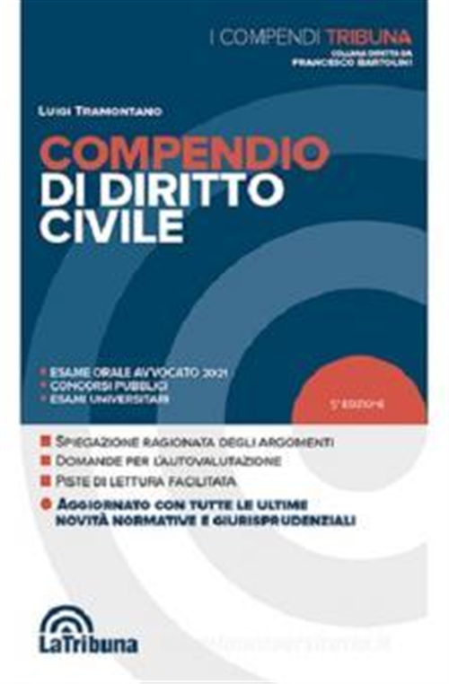 La nuova Collana Compendi Tribuna si rivolge ai candidati ai concorsi pubblici, agli studenti universitari e a tutti coloro i quali siano chiamati a sostenere prove d’esame per l’abilitazione professionale, con particolare riguardo per l’esame orale di avvocato. I Compendi Tribuna si caratterizzano per chiarezza di esposizione, capacità di sintesi e taglio ad un tempo semplice quanto accurato, che consente di apprendere e memorizzare facilmente ogni argomento affrontato. Fra i punti di forza di ogni volume, segnaliamo: - l’accurata suddivisione degli argomenti in paragrafi e sottoparagrafi; - la sapiente utilizzazione delle piste laterali di lettura, che permettono di individuare immediatamente i concetti fondamentali della materia trattata; - l’utilissima selezione di domande per l’autovalutazione immediata del proprio livello di apprendimento; - l’alto livello di aggiornamento normativo e giurisprudenziale; - la presenza dell’indice analitico alfabetico, che rende agevole la ricerca degli argomenti e degli istituti. Il Compendio di Diritto civile, espone in sintesi, ma con estrema chiarezza ed esaustività, tutta la materia normalmente oggetto di esami universitari o di prove di concorso e dà ampio spazio agli orientamenti della dottrina e della giurisprudenza. Gli aspetti salienti della disciplina sono evidenziati attraverso l’uso di piste di lettura a margine del testo. Si avvale, inoltre, di apparati didattici che permettono di ottimizzare l’apprendimento e di avere a disposizione, in un unico volume, molteplici strumenti di studio e di riepilogo della materia (schemi per ricapitolare l’argomento studiato e favorirne l’apprendimento, domande di fine capitolo, che propongono le più frequenti domande d’esame).