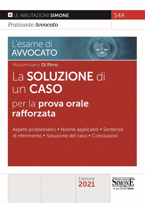 La soluzione di un caso per la prova orale rafforzata costituisce una novità editoriale utile ad affrontare l’esame di abilitazione forense durante la fase emergenziale da COVID-19. Il nuovo esame di avvocato, infatti, prevede due prove orali: la prima prova riguarda la discussione di una questione teorico-pratica su una delle materie sostanziali a scelta del candidato tra diritto civile, penale e amministrativo. La questione da esaminare è sorteggiata tra tre ipotesi possibili e durante l’esame del caso è possibile utilizzare codici commentati; la seconda prova riguarda la discussione di diverse materie: una tra diritto civile e penale (la materia scartata nella prima prova); una procedura a scelta (civile o penale); tre questioni tra diritto costituzionale, amministrativo, tributario, commerciale, lavoro, Unione europea, ecclesiastico, diritto internazionale privato. Viene, inoltre, accertata la conoscenza dell’ordinamento forense. Questo nuovo libro ha ad oggetto «l’esame di una questione pratico-applicativa, nella forma della soluzione di un caso» in una materia scelta dal candidato tra il diritto civile, il diritto penale o il diritto amministrativo. Per lo svolgimento della prova ogni sottocommissione predispone tre quesiti in busta chiusa e il candidato ne sceglie una: si può immaginare che le singole commissioni, analogamente a quanto è sempre accaduto per la formulazione dei quesiti da parte del Ministero della Giustizia, selezionino le questioni da porre ai candidati sulla base delle sentenze più recenti della Cassazione, dalle quali sono ricavati anche i casi del presente manuale. I casi contenuti nel presente lavoro, quindi, sono stati articolati tenendo conto delle modalità con le quali, verosimilmente, si svolgerà la prima prova orale: sarà assegnato un caso da risolvere che imponga di individuare le questioni problematiche e l’atto giudiziario da utilizzare. Il candidato, quindi, nella prima parte della prova dovrà redigere un breve schema che tocchi gli aspetti principali della vicenda, individuare le norme e la giurisprudenza applicabile (il candidato potrà consultare i codici commentati) e poi indicare la soluzione del caso. Le due materie che tradizionalmente vengono scelte, il diritto civile e il diritto penale, sono contenute in questa edizione cartacea, mentre il diritto amministrativo, materia più di nicchia, è riportato in espansione on line.