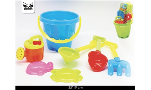 SET DI 9 GIOCHI DA SPIAGGIA PER BAMBINI. IL SECCHIELLO A FORMA DI TORRE DIVENTA A SUA VOLTA UNA MAXI FORMINA. 35X19 CM.