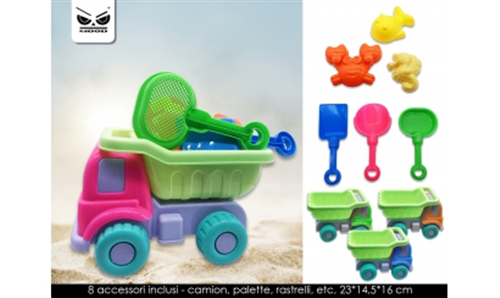 8 accessori inclusi - camion, palette, rastrello e formine. Misure: 23*14,5*16 cm.
