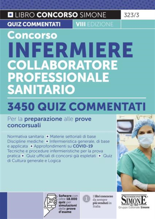 Il manuale Concorso Infermiere Collaboratore professionale sanitario. 3.450 quiz commentati, giunto alla sua VIII edizione, e specificatamente indirizzato a quanti intendono prepararsi alle prove preselettiva, scritta e pratica di tutti i concorsi pubblici riservati a questo profilo professionale. Gli argomenti trattati nei singoli questionari sono stati selezionati in modo da rispecchiare perfettamente le discipline che normalmente ricorrono nei programmi d’esame dei concorsi banditi dalle Aziende ospedaliere e dalle ASL delle diverse Regioni italiane, al fine di includere conoscenze e competenze su cui deve imperniarsi la preparazione richiesta per l’accesso alla professione: dalle prerogative di carattere istituzionale e normativo alle procedure più strettamente operative, tenendo conto anche dell’emergenza legata all’attuale pandemia da COVID?19. Pertanto vengono proposti ben 3.450 quesiti a risposta multipla, sempre con soluzioni commentate la dove richieste, suddivisi nelle seguenti sezioni: Ambito istituzionale e legislativo; Cultura settoriale di base; Discipline mediche; Materie infermieristiche; Esempi di procedure infermieristiche per la prova pratica; Quiz ufficiali di concorsi già espletati; Quiz per prove preselettive. A completamento dell’opera, un avanzato software con oltre 18.000 quiz, comprensivi di tutti i quesiti contenuti nel testo e di circa 15.000 quiz ufficiali di concorsi già espletati, per infinite esercitazioni e simulazioni delle prove d’esame. Per completare la preparazione si consiglia il volume: Concorso Infermiere – Collaboratore professionale sanitario. Manuale completo per la preparazione a tutte le prove concorsuali.