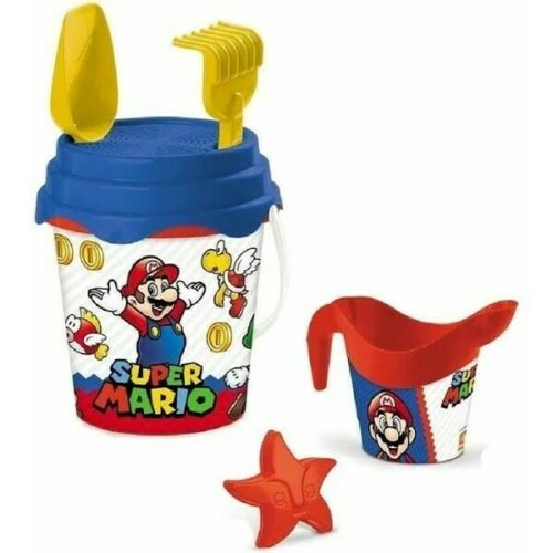Super Mario Set mare Secchiello e paletta. Porta con te anche in spiaggia il tuo amico Mario con il nuovo Set mare secchiello e paletta di Super Mario, il set include un secchiello da 17 cm setaccio, paletta rastrello e innaffiatoio e formine.