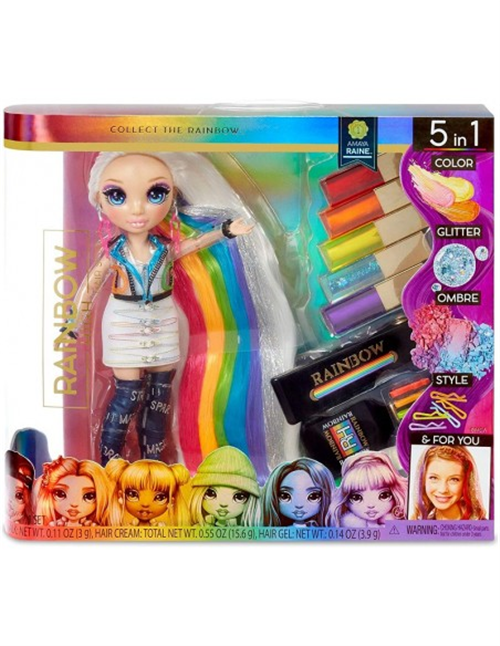 Bambola Rainbow Amaya Raine High Hair Studio Con Capelli Extra Lunghi E Colori Lavabili 5 In 1. SET DI GIOCO PER CAPELLI 5 IN 1 - Include creme colorate per capelli, lustrini, gessetti per capelli e accessori di stile. BAMBOLA ESCLUSIVA AMAYA RAINE - I suoi capelli platino extra lunghi con accenti argentati hanno un arcobaleno sotto. Ha un completo arcobaleno affascinante con un top e una gonna, una giacca traslucida, orecchini a stella e stivali spettacolari.