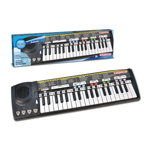 Tastiera digitale 37 tasti mini (DO-DO) • Polifonia 3 note • 4 tasti di selezione: 8 Suoni • 8 Ritmi • 14 canzoni preregistrate con Melody Off • 4 Drum Pads • 16 tasti di controllo per la selezione di: General Volume, Tempo, Start/Stop, Accensione, Record e Play • Spegnimento automatico • Schede con 8 canzoni • Alim: 3 batterie da 1,5V R6/AA (non fornite) • Dim: 440x125x45 mm