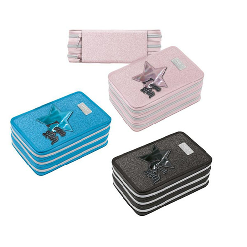 L'astuccio 3zip TintaUNITA Glamour accessorio immancabile in ogni corredo scolastico. Il modello 3zip è il classico astuccio che permette di tenere organizzato in 3 scomparti chiusi tutto il materiale di cancelleria. I materiali sono altissimo livello con tessuto glitterato resistenze agli strappi, cerniere in tono con la grafica del prodotto.L'interno è riempito con 18 pastelli TintaUNITA dai colori super brillanti con una robustissima mina da 4mm ideale per i nostri piccoli artisti, 18 pennarelli TintaUNITA sottili due penne cancellabili blu/rossa Ghost e il necessario per il disegno di precisione.