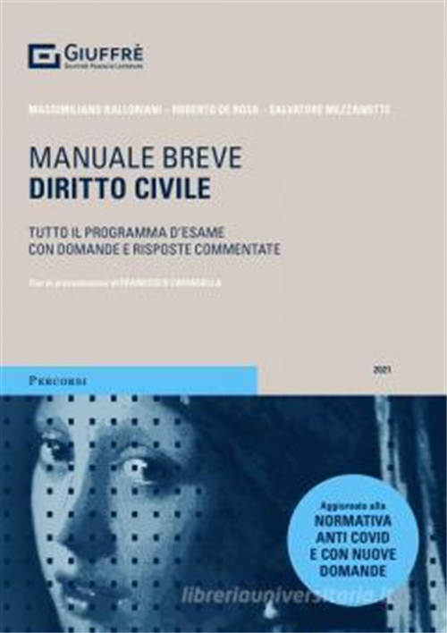 Il volume è aggiornato con gli ultimi provvedimenti normativi introdotti nel nostro ordinamento, segnatamente: - d.l. 23 febbraio 2020, n. 6, convertito con modificazioni dalla legge 5 marzo 2020, n. 13; - d.l. 17 marzo 2020, n. 18, convertito con modificazioni dalla legge 24 aprile 2020, n. 27 contenente Misure di potenziamento del Servizio sanitario nazionale e di sostegno economico per famiglie, lavoratori e imprese connesse all'emergenza epidemiologica da Covid-19. Il Manuale analizza, con un taglio teorico e pratico e un linguaggio chiaro e immediato, tutti i profili del diritto civile, offrendo al lettore un quadro esaustivo dei più recenti interventi legislativi nonché delle evoluzioni giurisprudenziali e dottrinali. Gli autori, in questa nuova edizione, hanno continuato ad approfondire e aggiornare la precedente trattazione, in linea con l’obbiettivo di fornire uno strumento utile anche per la preparazione agli esami scritti più impegnativi (concorso notarile e da magistrato, abilitazione alla professione forense), oltre che per studiosi, professionisti e cultori della materia. Un insieme di schemi sugli istituti civilistici principali ed una dettagliata selezione di domande e risposte commentate (realmente poste in sede d’esame) completano il volume fornendo al lettore la possibilità di un’efficace autoverifica in vista della prova orale. Indice: - PARTE PRIMA: LA NORMA GIURIDICA. LE SITUAZIONI GIURIDICHE SOGGETTIVE. I SOGGETTI DI DIRITTO. - PARTE SECONDA: LA FAMIGLIA. - PARTE TERZA: FATTO, ATTO E NEGOZIO GIURIDICO. - PARTE QUARTA: I DIRITTI REALI. - PARTE QUINTA: L’OBBLIGAZIONE. - PARTE SESTA: IL CONTRATTO. - PARTE SETTIMA: L’ILLECITO EXTRACONTRATTUALE. - PARTE OTTAVA: LA PUBBLICITÀ. - PARTE NONA: LE SUCCESSIONI A CAUSA DI MORTE E LE DONAZIONI. - PARTE DECIMA: I MEZZI DI PROVA. - PARTE UNDICESIMA: DOMANDE E RISPOSTE COMMENTATE.