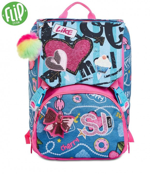 Ciao! Sono lo zaino estensibile SJ Gang JUST DENIM GIRL, dotato di charm PLUSHY RAINBOW, di patch in paillettes e di dettagli rifrangenti, che ti accompagna a scuola in modo divertente e giocoso! Infatti grazie al mio FLIP SYSTEM puoi divertirti a cambiarmi le grafiche, così avrai uno zaino sempre diverso! Ho un ampio doppio scomparto, la cui capienza si può facilmente moltiplicare grazie alle zip laterali per poter accogliere e distribuire in modo ottimale anche i carichi più pesanti. Con lo schienale Ergosystem preformato e gli spallacci imbottiti e traspiranti sono comodo da indossare sulle spalle, mentre il fondo integrato fa sì che la mia struttura rimanga inalterata e stabile anche a pieno carico.