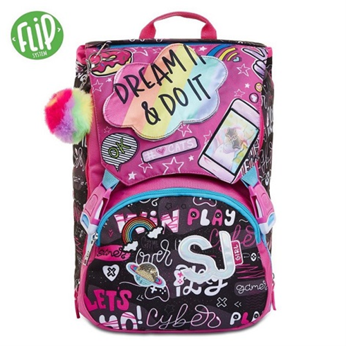 Ciao! Sono lo zaino estensibile SJ Gang DREAM & DO GIRL, dotato di charm PLUSHY RAINBOW e patch olografico, dettagli rifrangenti e applicazioni, che ti accompagna a scuola in modo divertente e giocoso! Infatti grazie al mio FLIP SYSTEM in satin puoi divertirti a cambiarmi le grafiche, così avrai uno zaino sempre diverso! Ho un ampio doppio scomparto, la cui capienza si può facilmente moltiplicare grazie alle zip laterali per poter accogliere e distribuire in modo ottimale anche i carichi più pesanti. Con lo schienale Ergosystem preformato e gli spallacci imbottiti e traspiranti sono comodo da indossare sulle spalle, mentre il fondo integrato fa sì che la mia struttura rimanga inalterata e stabile anche a pieno carico.