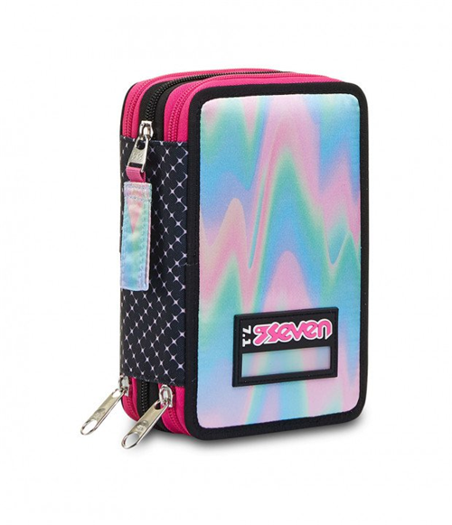 DETTAGLI L’astuccio Seven 3 zip ha tre scomparti in cui troverai tutto il materiale necessario per la tua giornata di scuola: 1 penna cancellabile PILOT FRIXION ball 0,7 con inchiostro di colore blu, 1 penna a sfera FILA TRATTO 1GRIP con inchiostro di colore rosso, 18 pennarelli GIOTTO TURBOCOLOR, 18 pastelli a colori GIOTTO SUPERMINA, 1 matita grafite LYRA TEMAGRAPH, 1 colla stick PRITT , 1 gomma, 1 temperino, 1 righello trasparente, 1 goniometro trasparente, 1 forbice in metallo con maniglia in plastica. A te non resta altro che abbinarlo a uno zaino o a un trolley Seven.