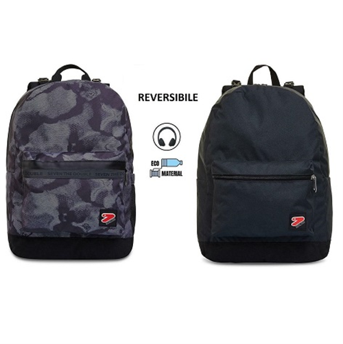 Con lo zaino reversibile Seven The Double hai 2 zaini in 1: uno in fantasia, l’altro in tinta unita. Per rigirarlo tutte le volte che vuoi, staccando lo schienale, ti bastano 3 semplici mosse. Lo zaino reversibile è fatto in tessuto di poliestere riciclato ricavato da 29,5 bottiglie in PET da 500 ml, garantendo tutti gli standard qualitativi dei nostri materiali. Entrambi i lati, in fantasia e in tinta unita, hanno una comoda tasca frontale e quello in fantasia ha anche una tasca laterale porta borraccia. Infine lo schienale è imbottito e insieme agli spallacci imbottiti e traspiranti rende lo zaino comodo da indossare sulle spalle.