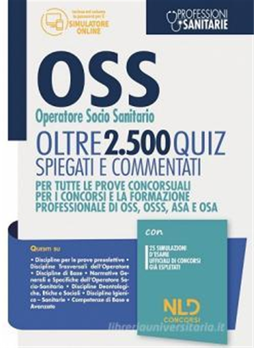 Nel volume vengono offerti oltre 2500 quiz commentati a risposta multipla che puntano al ripasso degli argomenti più svariati. I quesiti hanno lo scopo di mettere alla prova su tecniche e procedure sanitarie affrontando una serie di domande dedicate alle Discipline per le prove preselettive (Cultura Generale, Logica e Italiano); Discipline Trasversali dell’Operatore (Informatica, Matematica e Geometria, Fisica, Statistica e Inglese) Discipline di Base (Biologia, Chimica, Anatomia e Medicina); normative Generali e Specifiche dell’Operatore Socio-Sanitario (Legislazione Sanitaria, Normativa giuridica dell’OSS, Management e Rischio Clinico); Discipline Deontologiche, Etiche e Sociali (Deontologia e Sicurezza nei luoghi di lavoro, Psicologia e Assistenza Sociale); Discipline Igienico – Sanitari (Igiene e Cultura Specifica); Competenze di Base e Avanzate (Emergenza e Urgenza) e Prestazioni operative dell’OSS. Infine, l’ultima parte è dedicata alle Simulazioni d’esame e offre 25 simulazioni d’esame ufficiali di concorsi già espletati al fine di verificare la preparazione e le conoscenze del candidato su tutte le materie oggetto della prova scritta. Infine, con la password in coda al volume, è possibile avere accesso al SIMULATORE ONLINE, ed esercitarsi con svariati quiz divisi per argomento