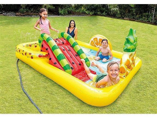 Piscina gonfiabile playcenter a forma di frutta misure 244x191 cm. Ha 1 scivolo di anguria per scivolare giù e atterrare sul pavimento imbottito e 3 frutti gonfiabili: 1 ananas, 1 arancia e 1 mini fragola. Include anche 6 palline colorate da adattare ai fori dell'arancia e dell'ananas. La piscina gonfiabile ha un peso massimo di 81 kg e una capacità massima di 493 litri di acqua (riempimento fino a 20 cm di altezza).