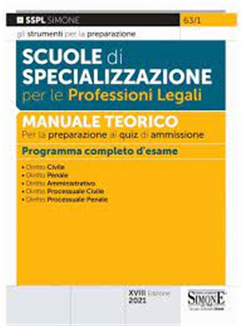 Le Scuole di specializzazione per le professioni legali (istituite con D.M. 537/1999) provvedono alla formazione comune dei laureati in giurisprudenza, attraverso un approfondimento teorico-pratico, finalizzato alla carriera di magistrato ordinario o all’esercizio delle professioni di avvocato o notaio. I corsi di tali Scuole si caratterizzano per il forte taglio pratico anche per sopperire all’impostazione meramente teorica che caratterizza la formazione universitaria. A tal fine l’attività didattica, svolta sia da docenti universitari sia da avvocati, magistrati e notai, viene svolta soprattutto attraverso esercitazioni, simulazioni di casi, stage e tirocini, formulazione di atti giudiziari, atti notarili, sentenze e pareri. La presente opera, di taglio teorico, si propone di venire incontro a tutti gli studenti che devono affrontare la prova preselettiva d’ingresso alle scuole di specializzazione. Questo volume, in particolare, è suddiviso in 5 libri dedicati ciascuno alle materie obbligatorie d’esame (diritto civile, diritto penale, diritto amministrativo, procedura civile e procedura penale) e consente un agevole ripasso delle singole discipline, in quanto tratta in maniera sintetica, ma esaustiva i principali argomenti, potenzialmente oggetto di domanda d’esame, tenendo conto che il lettore possiede già una conoscenza istituzionale acquisita durante il corso degli studi universitari: ciò spiega la peculiarità espositiva che si giova anche di tavole sinottiche soffermandosi con più attenzione sui concetti generali e sui principali istituti. Il lavoro è arricchito inoltre da esempi di domande che permettono di avere una panoramica sui possibili argomenti oggetto delle prove orali.