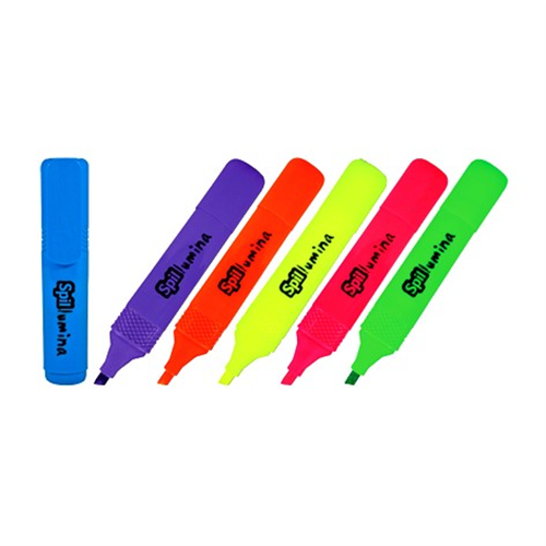 SPILLUMINA evidenziatore a scalpello in 6 colori brillanti. Impugnatura antiscivolo, tappo con clip e 4g di inchiostro.