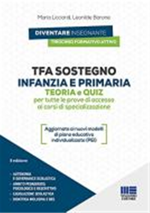 Il manuale è un utile strumento di preparazione a tutte le prove di accesso (preliminare, scritta e orale) per l'ammissione al nuovo ciclo di TFA sostegno dedicato alla scuola dell'infanzia e alla scuola primaria. Il testo tratta tutti gli argomenti richiesti dai bandi, suddividendoli nelle seguenti Aree: - Area normativa: autonomia e governance scolastica; inclusione scolastica e quadro normativo; governance educativa nei documenti nazionali ed europei; - Area teorica psicopedagogica: ambito pedagogico (teorie pedagogiche, competenze psicopedagogiche); ambito psicologico (teorie su creatività, intelligenza e competenza emotiva; sviluppo psicologico e psicodinamico); ambito descrittivo (principali quadri diagnostici, disturbi specifici dell'apprendimento); - Area didattica: legislazione scolastica e riforme ordinamentali (competenze pedagogico didattiche, le neuroscienze nella pratica didattica); didattica inclusiva alla luce dei Bisogni educativi Speciali (didattica inclusiva, media education e nuove possibilità per la didattica inclusiva). Il volume presenta una sezione dedicata alla simulazione della prova scritta presentando una selezione di temi svolti sugli argomenti maggiormente richiesti. In questa seconda edizione sono presenti un'utile Appendice sui nuovi modelli di PEI, introdotti dal decreto interministeriale n. 182/2020 e una selezione di quiz ufficiali dei cicli precedenti. Nella sezione online, raggiungibile tramite il codice riportato in fondo al volume, sono disponibili ulteriori test ufficiali della prova preliminare assegnate da alcune università nei cicli precedenti.