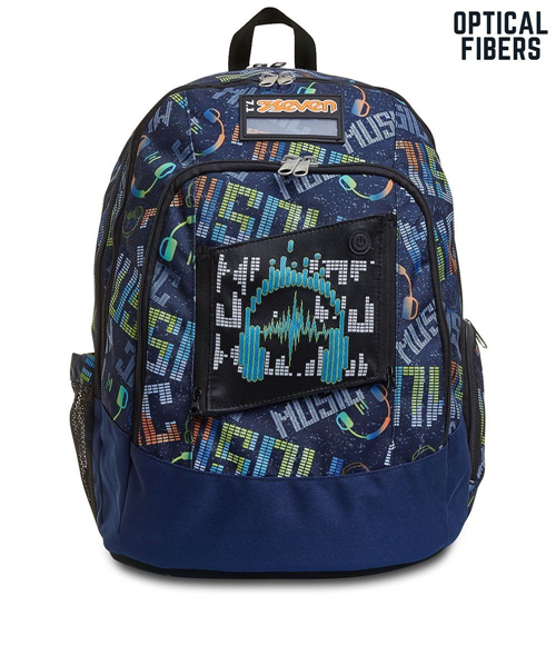 Lo zaino Seven Advanced MUSICBRIGHTING, curato nei minimi dettagli, è dotato di una fantastica grafica con cuffie in fibre ottiche che puoi divertirti ad accendere ogni volta che vuoi tramite l’apposito pulsante. L’inserto su cui sono posizionate è removibile per permettere il lavaggio dello zaino, che è comodo da portare sulle spalle grazie allo schienale Ergosystem preformato e agli spallacci imbottiti, traspiranti e con inserti rifrangenti. Il fondo integrato, poi, ne mantiene inalterata la struttura anche a pieno carico, garantendo la stabilità del contenuto. Nel suo capiente e spazioso doppio scomparto c’è posto davvero per tutto quello che ti serve, anche per il tuo notebook e la tua borraccia, potendo contare anche sulle sue numerose e pratiche tasche.