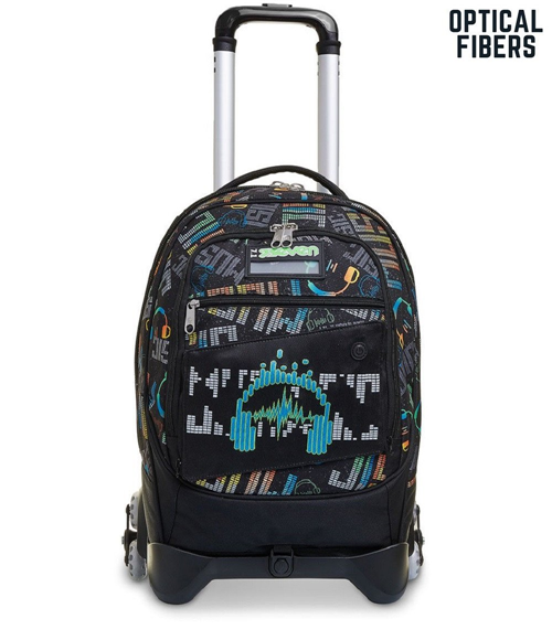 Il Trolley Jack-3WD Seven MUSICBRIGHTING, dotato di un sistema a 3 ruote che agevola la salita dei gradini, è pieno di stile e multiuso. Ha una fantastica grafica con cuffie in fibre ottiche che puoi accendere ogni volta che vuoi tramite l’apposito pulsante e in poche semplici mosse da trolley diventa zaino e viceversa. Il carrello ha fondo rinforzato e protezioni angolari che danno stabilità al trolley e protezione al contenuto. Lo sganci e hai uno zaino lavabile (rimuovendo l’inserto su cui è posizionato il dispositivo in fibre ottiche), maxi capiente, dotato di tasca frontale e tasca porta borraccia, comodo da indossare grazie a schienale e spallacci imbottiti. Spallacci che, se lo usi come trolley, possono essere a scomparsa o, grazie al CROSSOVER SYSTEM, sollevarsi automaticamente tirando su la resistente doppia barra telescopica con due regolazioni in altezza, evitando che i nastri striscino a terra.