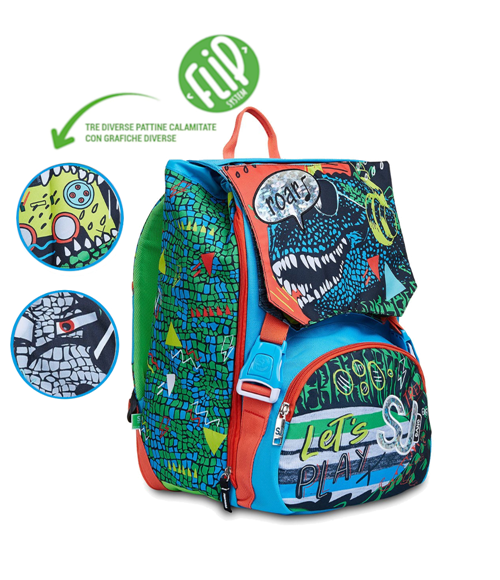 Zaino doppio scomparto estensibile tramite zip laterali. Flip System su pattina: 2 grafiche diverse. Sistema musicale sulla pattina principale attivabile con pulsante on/off. Il suono viene attivata tramite lo sfioro della pattina.