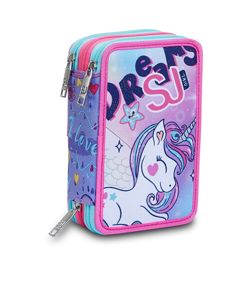 Ciao! Sono il nuovissimo Astuccio 3 Zip Color ANIMALI DA SJ GIRL! All’interno dei miei tre scomparti troverai ben 36 pastelli a colori GIOTTO SUPERMINA! In più per poter fare al meglio i tuoi lavori a scuola avrai a disposizione anche: 1 penna a sfera cancellabile PILOT FRIXION BALL 0,7 con inchiostro di colore blu, 1 penna a sfera FILA TRATTO 1UNO GRIP con inchiostro di colore rosso, 1 colla stick PRITT, 1 matita grafite LYRA TEMAGRAPH, 1 gomma, 1 temperino, 1 righello trasparente, 1 goniometro, 1 forbice in metallo con maniglia in plastica. Le mie grafiche sono coloratissime. Abbinami a uno zaino o a un trolley SJ Gang.