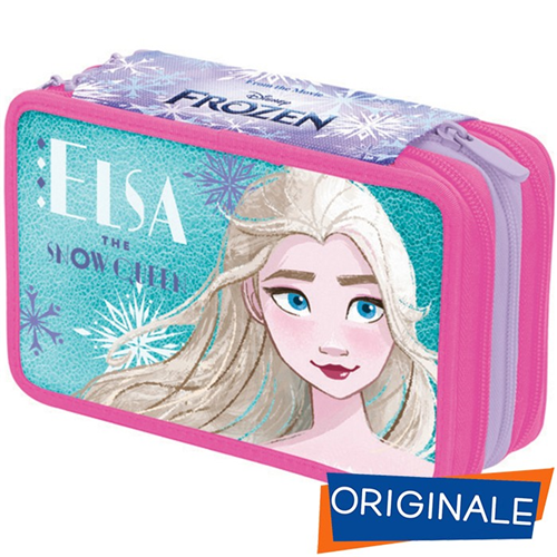 Astuccio 3 zip con corredo Frozen - Seven: Tessuto poliestere stampato con ecopelle iridescente. Dimensione: 12,5 x 19,5 x 7 cm. Contiene 43 pezzi. Contenuto: 1 pz. penna cancellabile Tratto Cancellik - colore blu. 1 pz. penna a sfera Tratto 1Uno - colore rosso. 18 pz. pastelli Colour Code. 18 pz. pennarelli Giotto Turbo Color. 1 pz. matite grafite Fila. 1 pz. gomma. 1 pz. temperino. 1 pz. righello trasparente. 1 pz. forbice in metallo con maniglia in plastica.