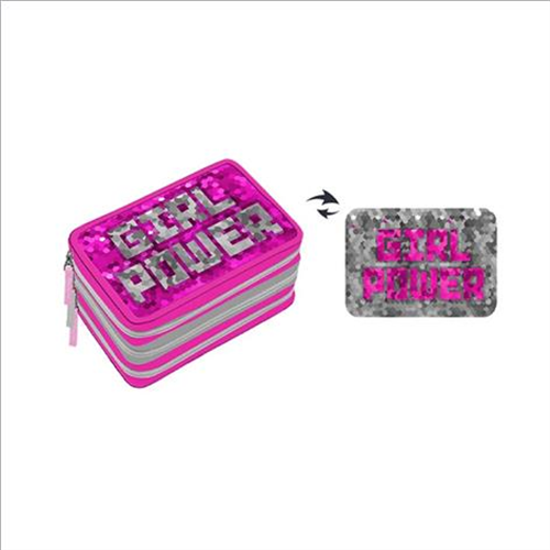 Astuccio 3 zip PlayToy - con paylettes girabrilla - rosa con scritta "Girl Power"