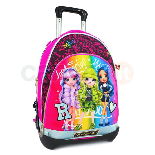 Bhack To School 2021-2022 in compagnia delle Fashion Doll più amate dalle Bambine con l'esclusiva Collezione Rainbow High prodotta da Franco Cosimo Panini. I colori dell'Arcobaleno e le immagini di Ruby Anderson, Poppy Rowan, Sunny Madison, Jade Hunter, Skyler Bradshaw e Violet Willow, donano un tocco davvero glamour su tutta la Linea. Il Trolley Rainbow High è ideale per la Scuola Elementare, ma non solo...all'occorrenza è perfetto anche per Gite e Vacanze fuori porta. Con Zaino completamente staccabile, ruote sostituibili e facile ancoraggio allo zaino con pratiche fascette in velcro. Dimensioni: 31,5x43,5hx22 cm. Prodotto ufficiale Rainbow High by F. C. Panini.