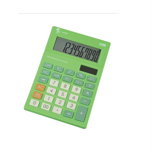 Calcolatrice da banco con schermo inclinato, doppia alimentazione, 12 cifre. Dimensioni: 146x100x29,6mm. Disponibile in 4 colori.