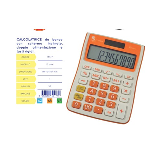 Calcolatrice da banco con schermo inclinato, doppia alimentazione, 12 cifre. Dimensioni: 148x105x27mm. Disponibile in 3 colori.