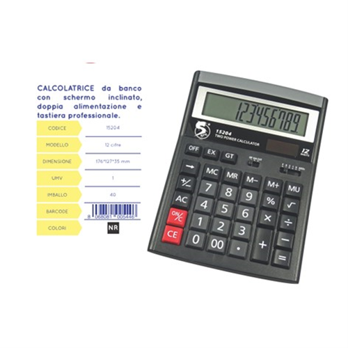 Calcolatrice da banco con schermo inclinato, doppia alimentazione, 12 cifre e tasti tipo PC. Dimensioni: 176x127x35mm.
