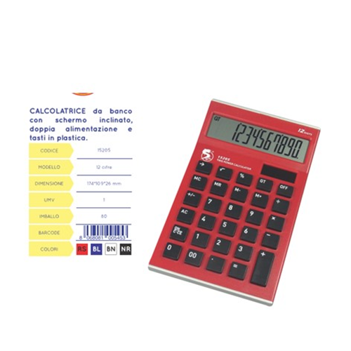 Calcolatrice da banco con schermo inclinato, doppia alimentazione, 12 cifre e tasti in plastica.