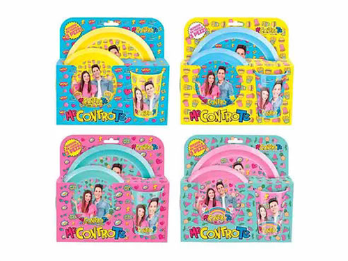 Kit 3 pz Me contro Te in melanina - piatto piano + piatto fondo + bicchiere - col. ass.