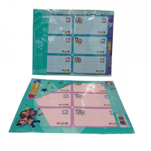 Etichette adesive Me Contro Te per libri o quaderni; ogni busta contiene 12 etichette fucsia e 6 etichette blu.