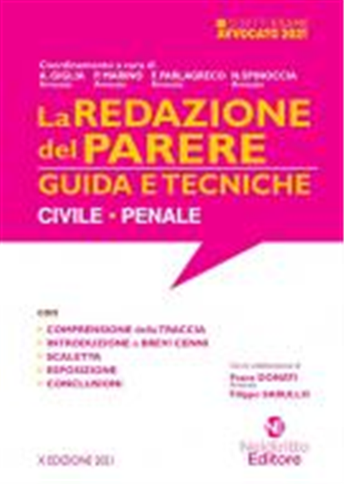 Il volume nasce dall'esperienza didattica maturata dagli Autori e si propone di fornire indicazioni e suggerimenti utili a chi si accinge ad affrontare la prova scritta dell'esame di abilitazione forense. Il libro è composto da cinque capitoli: nel primo, dopo aver trattato della prova scritta d'esame in generale e dei criteri di valutazione dell'elaborato, un'ampia parte è dedicata all'esposizione delle più importanti tecniche di argomentazione utili per la redazione della motivazione di un parere pro veritate. È questo l'obiettivo che principalmente il testo si pone, ed è per tali ragioni, dunque, che il secondo e il quarto capitolo sono dedicati alle tecniche di redazione rispettivamente del parere di diritto civile e del parere di diritto penale. In particolare, nel capitolo secondo, vi è l'analisi delle quattro principali tipologie di svolgimento: il primo parere con una linea interpretativa a favore dell'assistito; il secondo con una sola linea interpretativa a sfavore; il terzo con due o più linee interpretative, il quarto, cosiddetto parere ad ostacoli, con plurime questioni giuridiche legate tra loro e il quinto parere senza alcun precedente rinvenibile nei codici annotati. La stessa analisi viene eseguita, nel quarto capitolo, per le tracce di diritto penale. Il terzo capitolo contiene lo svolgimento dei pareri di diritto civile che, a differenza delle precedenti edizioni, include una parte teorica più ampia delle tematiche maggiormente rilevanti e più attuali. In particolare, ogni singolo parere prevede l'indicazione della normativa e della giurisprudenza di riferimento, una "scheda di guida alla lettura della traccia e di orientamento allo svolgimento del parere" che, a sua volta, comprende: l'analisi della traccia attraverso l'indicazione dei passaggi chiave utili per inquadrare la questione nodale oggetto del parere e le questioni giuridiche che saranno affrontate; le conseguenti modalità di utilizzo del codice normativo e dei rinvii in esso contenuti; l'ordine di trattazione ideale da seguire per lo svolgimento dell'elaborato. Segue una parte relativa ai suggerimenti sulla struttura e ai passaggi logici per lo svolgimento del parere, e, infine, l'approfondimento di alcune tematiche correlate agli istituti trattati che costituiscono oggetto dell'attuale dibattito giurisprudenziale e dottrinale. Lo schema appena descritto per lo svolgimento del parere di diritto civile, contenuto nel terzo capitolo, viene riproposto nel quinto per i pareri di diritto penale. L'opera, dunque, costituisce un'indispensabile e completo supporto per la preparazione all'esame di avvocato che non può prescindere dall'acquisizione di un buon metodo di lavoro e da una approfondita conoscenza degli istituti sostanziali e processuali