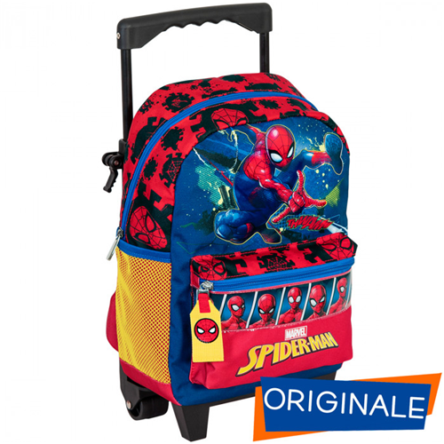 Trolley Small - Spiderman Dimensione: 24 x 31 x 14 cm. Capacità: 12 lt. Tessuto poliestere stampato. Schienale con fascia imbottita. Spallacci imbottiti. Aperture con zip a contrasto. Puller in nastro stampato. Spider-Man in serigrafia spessorata. Banda personalizzata in materiale trasparente applicata sulla tasca. Carrello fisso. Tasche porta borraccia in rete.
