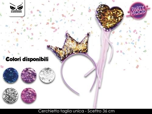 SET SCETTRO E CERCHIETTO ABBINATI CON PAILLETTES. H SCETTRO 36 CM.