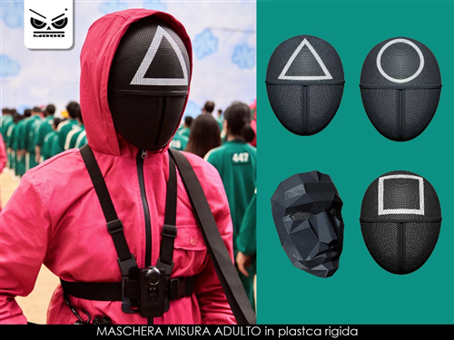 Bellissima maschera in PP ispirata alla famosa serie Netflix Squid Games. Popolarissima tra i più giovani, è destinata ad essere la serie TV più vista di sempre.