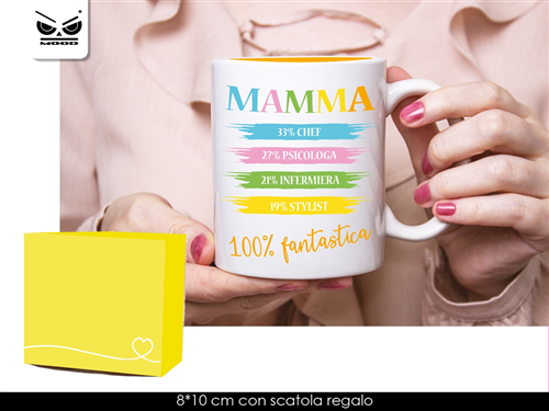 Tazza in ceramica con stampa esterna in quadricromia e colorata all'interno. Venduta in scatola regalo. Design originale Mood.